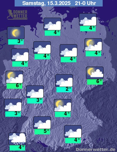 In der Nacht zum Sonntag fällt im Süden bei starker Bewölkung noch etwas Regen, Schneeregen oder Schnee. In den übrigen Landesteilen ist es sternenklar oder nur gering bewölkt, gebietsweise kann sich im Nachtverlauf Nebel bilden.