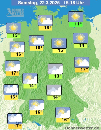 Am Samstagnachmittag scheint die Sonne von der Nordseeküste bis nach Ostsachsen von einem wolkenlosen Himmel. In den übrigen Landesteilen ist es meist heiter bis wolkig, in der West- und Südwesthälfte ist es auch stark bewölkt. Hier muss mit einzelnen Schauern oder leichtem Regen gerechnet werden. Im Südwesten sind zudem lokale Gewitter möglich.