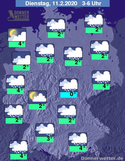 In der Nacht auf Dienstag bleibt der Himmel über weiten Teilen der Republik stark bewölkt oder bedeckt; dabei fallen immer wieder Niederschläge, in den Mittelgebirgen oberhalb von 300 bis 400 Metern auch als Schnee. Regional sind auch Gewitter möglich. Im Norden und Osten lässt der Wind in den Nachtstunden zunächst nach, bevor er in den Morgenstunden wie in den übrigen Landesteilen wieder Sturmstärke erreicht. Im Süden sind auch schwere Sturmböen möglich.
