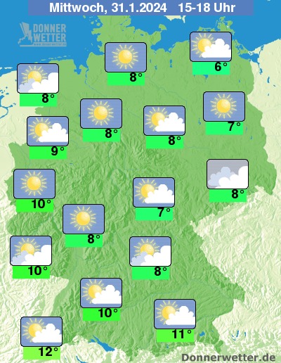 Die Temperaturen erreichen am Nachmittag Höchstwerte um 6 Grad an der Ostseeküste, um 12 Grad am Oberrhein.