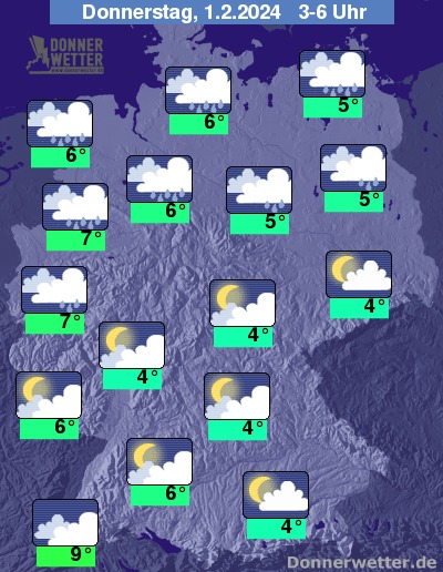 In der Nacht auf Donnerstag ist es zunächst noch verbreitet locker oder aufgelockert bewölkt und es bleibt trocken. Im Verlauf nimmt die Bewölkung von Nordwesten her zu und es kommt Regen auf, der in den frühen Morgenstunden auch den Süden des Landes erreicht. Nach Regendurchzug lockert es im Norden und Nordwesten in der zweiten Nachthälfte bereits wieder auf.