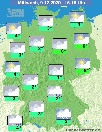 Am frühen Nachmittag überwiegt häufig dichtes Wolkengrau, ganz im Süden fällt noch Schnee oder Schneeregen mit Glättegefahr. Sonst bleibt es abgesehen von etwas Sprühregen trocken. Vor allem im Münsterland, sowie in Teilen von Sachsen und Brandenburg blinzelt auch mal die Sonne hervor.