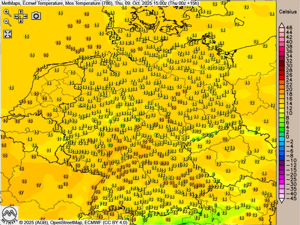 Die Lufttemperaturen und Wetterkarte für Donnerstagnachmittag nach ECMWF: