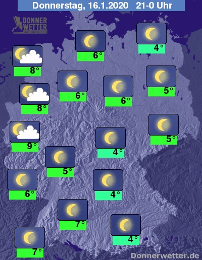 Bis zu den Frühstunden kühlt die Luft auf 1 bis 8 Grad ab, am mildesten bleibt es am Niederrhein und an der Ems. In Thüringen und Bayern kann es leichten Frost geben.