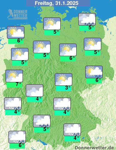 Am Freitag fällt vor allem am Alpenrand noch anhaltend Regen oder Schnee, in den übrigen Landesteilen ziehen die Niederschläge im Tagesverlauf nach Osten und Südosten ab. Bei größeren Auflockerungen weitgehend trocken bleibt es am Freitag im Westen, Nordwesten und der Mitte Deutschlands.