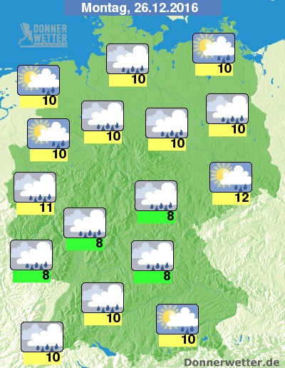 Zum Start in die neue Woche zeigt sich das Wetter über weite Landesteilen stark bewölkt und dazu regnerisch. Die größten Chancen auf mehr Sonnenschein haben die Menschen im Alpenvorland und im Tagesverlauf im Nordwesten Deutschlands. Im Norden weht ein oft starker, in Küstennähe ein verbreitet stürmischer Wind mit Sturmböen. Die Temperatur steigt auf insgesamt milde 8 bis 12 Grad.