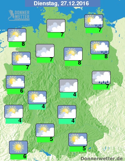 Am Dienstag halten sich vor allem über der Osthälfte oft dichte Wolken, aus denen gebietsweise Regen fallen kann. Teils zeigen sich hier aber auch Auflockerungen. Deutlich freundlicher und weitgehend trocken ist es weiter nach Westen und Südwesten, hier scheint auch häufig die Sonne. Die Temperatur erreicht Werte zwischen 4 und 8 Grad. An den Küsten von Nord- und Ostsee weht ein teils stürmischer Wind, dabei sind Sturmböen möglich.