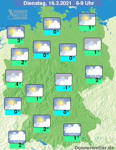 In der Nacht auf Dienstag bleibt der Himmel verbreitet bedeckt oder es ist aufgelockert bewölkt, vor allem zwischen Ostfriesland und dem Pfälzer Wald dominieren anfangs auch noch lockere Wolken. In den Mittelgebirgen sowie am Alpenrand muss in der Nacht noch mit einzelnen Schneeschauern gerechnet werden, in den Staulagen des Erzgebirges und des Schwarzwalds können einige Zentimeter Neuschnee fallen. Die Schneefallgrenze sinkt hier in der Nacht bis in tiefe Lagen. In den übrigen Landesteilen bleibt es meist trocken.