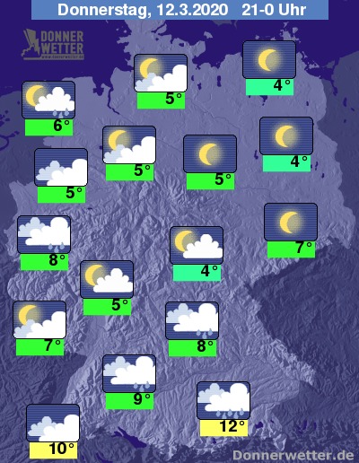 Bis Mitternacht fällt im Süden noch zeit- und gebietsweise Regen, an den Alpen auch kräftig. Im übrigen Land gibt es eine Mischung aus Wolken, Mond und Sterne mit örtlichen Schauern. Im Nordosten klart der Himmel auch für längere Zeit auf.