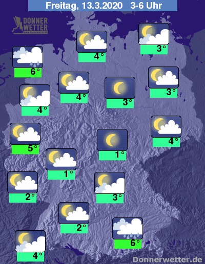 Während der zweiten Nachthälfte stauen sich die Wolken an den Alpen und regnen ab. In höheren Lagen verwandeln sich die Tropfne in Flocken. In den übrigen Bereichen kann man für längere Zeit die Sterne beobachten. Im Nordseeumfeld, sowie über Schleswig-Holstein peitscht der Wind weitere Schauer übers Land.