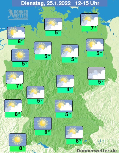 Heute Nachmittag halten sich über der Nordosthälfte meist dichte Wolken, im übrigen Land ist es teils dicht bewölkt, oft zeigen sich aber auch Aufheiterungen. Es bleibt landesweit trocken bei 4 Grad im Grabfeld und bis 8 Grad im Breisgau.