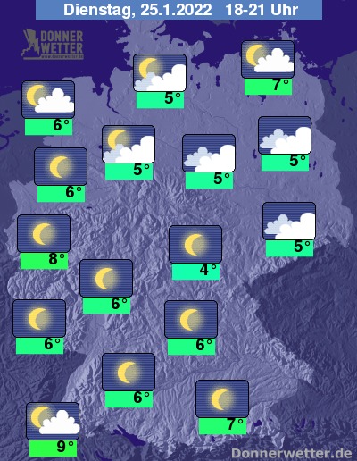 Heute Abend funkeln über der Südwesthälfte der Republik die Sterne von einem wolkenlosen Himmel. Weiter nach Nordosten hin bleibt es hingegen meist dicht bewölkt. Im Nordosten selbst ist es wiederum oft nur locker bewölkt. Es bleibt überall trocken bei 4 Grad in Erfurt und bis 9 Grad in Freiburg.