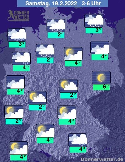In der folgenden Nacht lockert und klart der Himmel verbreitet auf. Im Norden ziehen jedoch weiterhin meist dichte Wolken übers Land hinweg und es fällt zeitweise Regen, Schneeregen oder Schnee. Im übrigen Bundesgebiet bleibt es weitgehend trocken. Über der Nordhälfte ist es verbreitet stürmisch mit schweren, teils orkanartigen Böen. Vor allem an der Nordsee sind verbreitet Orkanböen möglich. Die Temperatur sinkt auf 6 Grad in Dresden und bis 2 Grad in Hamburg.