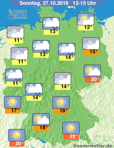 Heute Nachmittag scheint südlich des Mains und anfangs auch über Sachsen noch verbreitet die Sonne bei oft wolkenlosem Himmel, dabei bleibt es trocken. Im übrigen Land ziehen dichte Wolken durch und es fällt zeitweise auch Regen. Die Temperatur steigt auf 11 Grad an der Ems und bis 22 Grad in München.