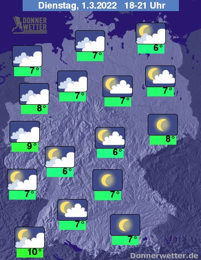 Heute Abend ist der Himmel nur noch über Bayern und Sachsen sternenklar, sonst ziehen von Nordwesten her mehr und mehr und nachfolgend auch dichte Wolken durch, dazu bleibt es trocken. Die Temperatur liegt bei 6 Grad in Erfurt und bis 10 Grad in Freiburg.