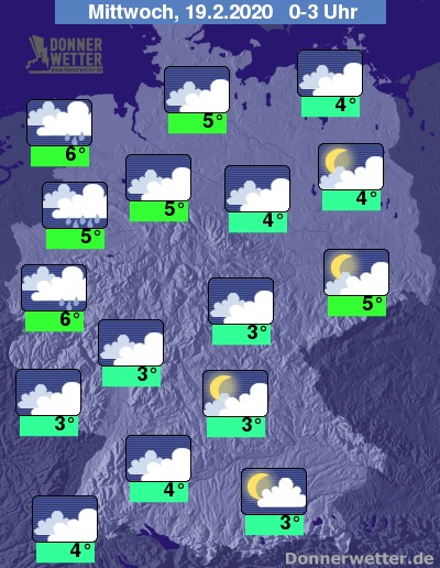 Während der zweiten Nachthälfte fällt im Norden und Westen zeitweise Regen. Die Schneefallgrenzen sinkt in den Mittelgebigen bis zum frühen Morgen auf etwa 500 Meter. Auch in der Südosthälfte nimmt die Bewölkung zu, es bleibt aber hier noch weitgehend niederschlagsfrei.