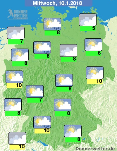 Am Mittwoch ist es vor allem im Süden oft heiter, teils aber auch stark bewölkt, jedoch überwiegend trocken, sonst ist es teils trüb, teils aufgelockert bewölkt, dabei bleibt es ebenfalls zum Großteil trocken. Die Temperatur steigt auf 5 Grad in Rostock und bis 10 Grad in Köln.