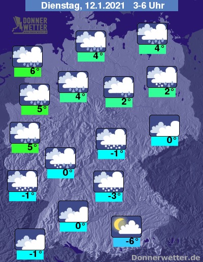 In der Nacht auf Dienstag verdichten sich die Wolken im Süden immer weiter, von Nordwesten breiten sich zudem neue Niederschlagsgebiete aus, die vor allem dem Norden und Westen Regen, höheren Lagen auch Schneeregen oder Schnee bringen. Der Wind frischt in den Nachtstunden auf und weht teils böig aus Südwest, an den Küsten und auf den Gipeln sind auch stürmische Böen oder Sturmböen möglich.