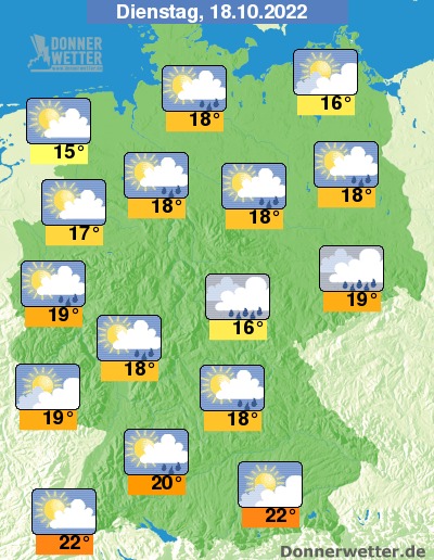 Heute ist es über dem Norden und Westen oft heiter, teils ziehen auch einige Wolken durch, jedoch bleibt es meist trocken. Im übrigen Bundesgebiet ziehen teilweise dichte Wolken durch, teils zeigen sich auch Aufheiterungen, dabei fällt gebietsweise Regen. Die Temperatur erreicht 15 Grad in Bremerhaven und bis 22 Grad in München.