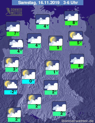 Bis zu den Frühstunden kühlt die Luft auf 1 bis 8 Grad ab, am mildesten bleibt es dabei in Teilen Sachsens. Vom Saarland, über die Pfalz, bis zum Rhein-Main-Gebiet kann es örtlich zu leichten Frösten zwischen -2 und 0 Grad und Reifglätte kommen.