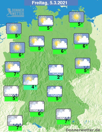 Am Freitag zeigt sich dem Himmel über dem Süden und Südosten Deutschlands meist bedeckt, dabei muss im Tagesverlauf immer wieder mit Regen- oder Schneeregenschauern gerechnet werden, in den östlichen Mittelgebirgen sowie an den Alpen fällt auch Schnee. In der Nordhälfte des Landes lockern die Wolken im Tagesverlauf zunehemend auf, so dass es nachmittags vor allem im Einzugsgebiet der Küste auch häufig sonnig ist. Es bleibt dabei meist trocken.