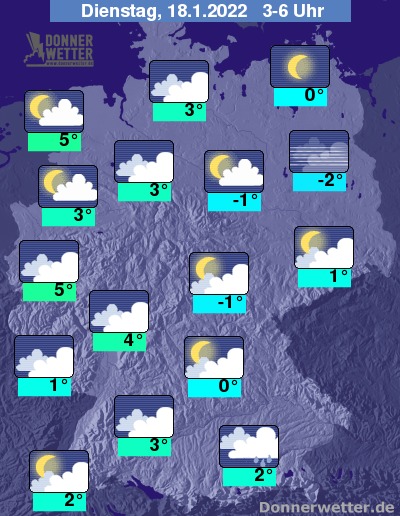 In der Nacht zum Dienstag fällt über Bayern zeitweise Regen oder Schnee, wobei sich die Niederschläge bis zum Morgen immer weiter auf den Alpenrand zurückziehen. Über dem Osten und Nordosten ist der Himmel meist sternenklar, sonst ist es überwiegend stark bewölkt oder neblig-trüb, jedoch bleibt es weitgehend trocken. Die Temperatur sinkt auf 5 Grad im Rheinland und bis -2 Grad im südlichen Brandenburg.