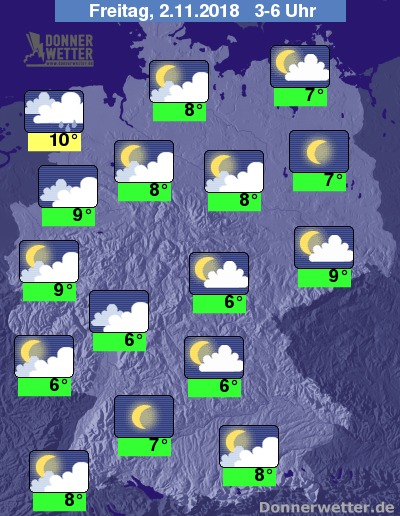 Während der zweiten Nachthälfte kann es ganz im Nordwesten gelegentlich noch etwas regnen, sonst bleibt es trocken und der Himmel klart teilweise auf. Stellenweise können sich einige Nebelfelder bilden. Bis zu den Frühstunden kühlt die Luft auf 5 bis 10 Grad ab, was jedoch für die Jahreszeit ziemlich mild ist. Am mildesten bleibt es unter den dichten Wolken im Emsland.