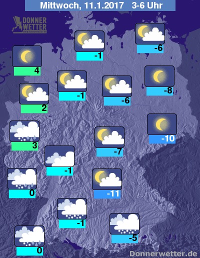 In der Nacht zum Mittwoch halten sich nach Südwesten hin dichte Wolken aus denen Schnee, Schneeregen oder auch teils Regen fällt, dabei besteht Glättegefahr! Weiter nach Nordosten hin ist der Himmel meist nur locker bewölkt, vor allem im Osten auch sternenklar, dazu bleibt es trocken. Die Temperatur sinkt auf 4 Grad in Emden und bis auf -11 Grad in Mittelfranken.