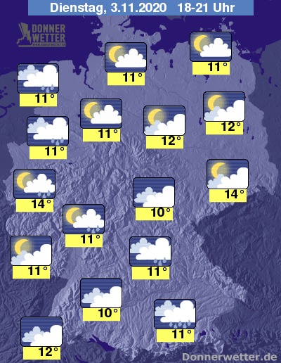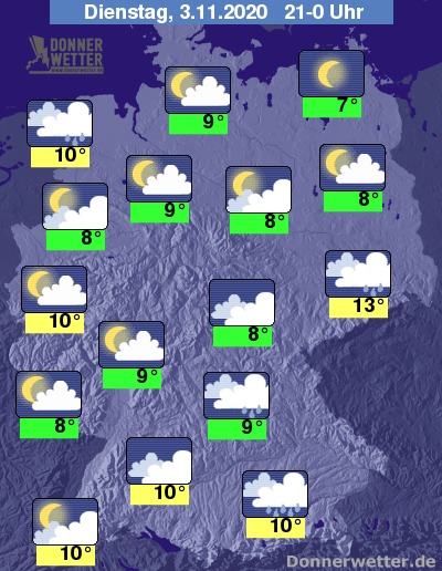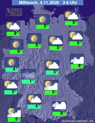 Während der zweiten Nachthälfte tröpfeln es an den Alpen noch, an der Nordsee können örtlich leichtere Schauer niedergehen. Sonst klart der Himmel teilweise verstärkt auf. Im Rhein Main Gebiet kann sich stellenweise Nebel bilden.
