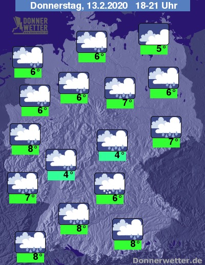 In den Abendstunden bleibt der Himmel über weiten Landesteilen stark bewölkt oder bedeckt. Auflockerungen beschränken sich später auf das Nordseeküstenumfeld - hier kann es am späteren Abend auch mal längere Regenpausen geben. Sonst muss in den kommenden Stunden immer wieder mit Regen gerechnet werden, die Schneefallgrenze liegt am Abend bei 800 bis 1.200 Metern.
