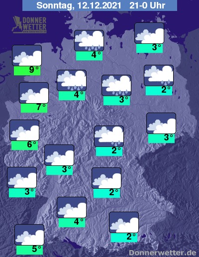 Die Temperaturen erreichen bis Mitternacht Werte um 2 bis 3 Grad entlang der Oder, 6 Grad im Rheinland und 9 Grad im Nordwesten.