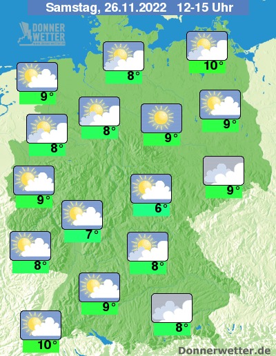 Heute Abend ist es über dem Bundesgebiet häufig nur locker oder wechselnd bewölkt, gebietsweise halten sich auch dichte Wolken. Es bleibt landesweit trocken bei Werten von 7 Grad in Erfurt und 10 Grad in Freiburg.