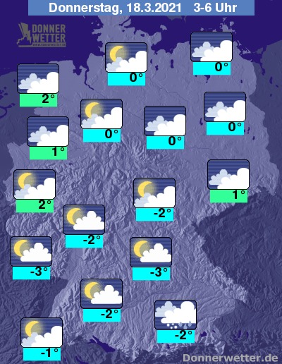 Die Werte sinken um -3 Grad in Mittelfranken, am mildesten bleibt es mit Temperaturen um 3 Grad am Niederrhein.