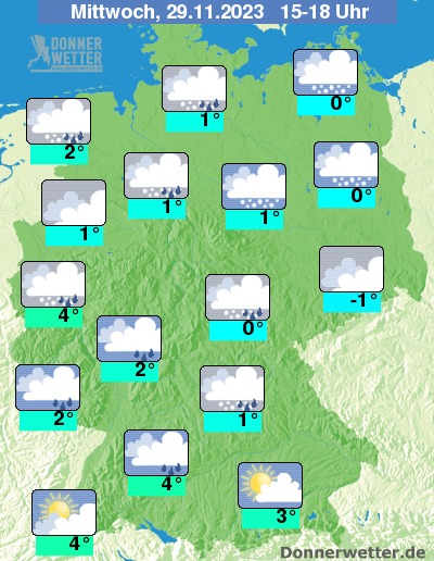Heute Nachmittag und am Abend zeigt sich der Himmel meist stark bewölkt, längere heitere Abschnitte beschränken sich auf das Gebiet südlich der Donau. Hier bleibt es in den nächsten Stunden auch meist trocken, sonst muss von Nordwesten her immer wieder mit Niederschlägen gerechnet werden. Diese fallen in den tiefen Lagen im Westen und Südwesten meist als Regen oder Schneeregen, sonst als Schnee.