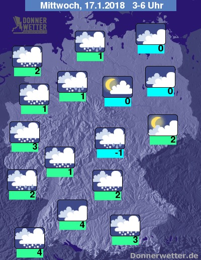 In der bevorstehenden Nacht bleibt es im Nordosten und Osten unter teils aufgelockerter, teils starker Bewölkung weitgehend trocken. Im übrigen Bundesgebiet bleibt es bedeckt und es fällt zeitweise Regen, Schneeregen oder Schnee. Dazu kann es entsprechend glatt auf den Straßen werden! Die Temperatur sinkt auf 4 Grad im Raum Stuttgart und bis etwa -1 Grad im Thüringer Becken.