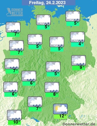 Am Freitag ziehen von Nordwesten her dichte Wolken durch und es fällt verbreitet mit Regen, teilweise auch Schneeregen oder Schnee bis in die Niederungen. Die Temperatur steigt auf 4 Grad in Berlin und bis 12 Grad in München.