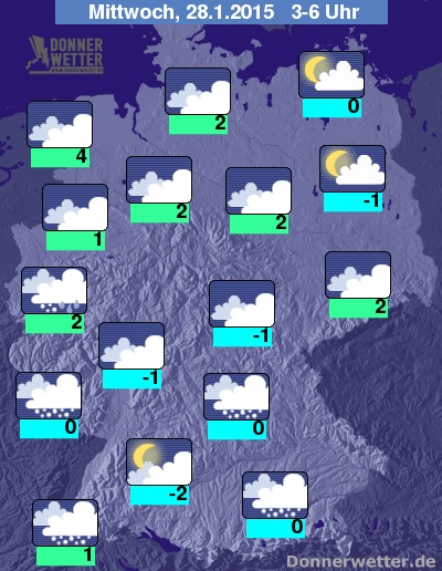 In der Nacht zum Mittwoch bleibt es größtenteils stark bewölkt, besonders in der Südhälfte der Republik bleiben die Wolken dabei zumeist dicht, hier fällt dazu immer wieder mal etwas Schnee, in den westlichen Landesteilen auch Schneeregen oder Regen. Es besteht Glättegefahr. Im Nordosten und im nördlichen Osten ist es meist aufgelockert bewölkt und trocken. Die Temperatur sinkt auf 4 Grad an der Nordseeküste und bis -2 Grad am Schwarzwald.
