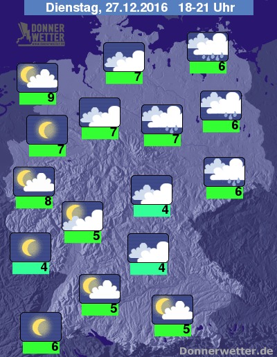 Heute Abend fällt unter dichten Wolken vom Osten bis in den Nordosten hinein zeitweise Regen. Dichtes Gewölk hält sich auch über dem Südosten, hier ist gebietsweise Regen oder Schneeregen möglich. Weiter nach Westen hin wird der Niederschlag seltener und über der Westhälfte ist es auch verbreitet nur locker bewölkt oder sternenklar und dazu trocken. Die Temperatur liegt bei Werten zwischen 4 und 9 Grad. Im Küstenumfeld von Nord- und Ostsee ist es oft noch stürmisch.