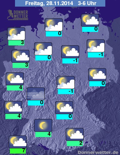 In der Nacht zum Freitag ist es verbreitet locker oder aufgelockert bewölkt, im Süden wird es gebietsweise auch sternenklar, dazu bleibt es trocken. Stellenweise bildet sich Nebel oder Hochnebel. Die Temperatur sinkt bis zum Morgen auf recht milde 7 Grad in Freiburg und auf kalte -1 Grad im Raum Berlin-Brandenburg.