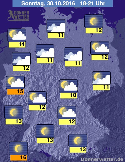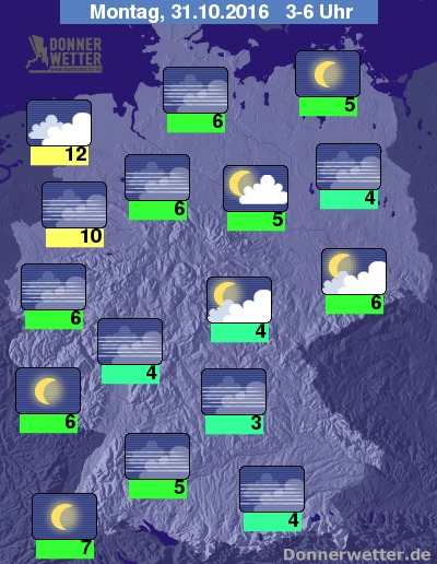 In der Nacht zum Montag halten sich vom Emsland bis zum Niederrhein, sowie über Teilen der Mitte Deutschlands gebietsweise dichte Wolken aus denen es gelegentlich regnen kann. Im größten Teil der Bundesrepublik zeigt sich der Himmel aber nur leicht bewölkt oder sternenklar und es bleibt dazu trocken. Stellenweise bildet sich jedoch wieder Nebel oder Hochnebel. Die Temperatur sinkt auf 12 Grad in Emden und bsi etwa 3 Grad in Oberfranken.
