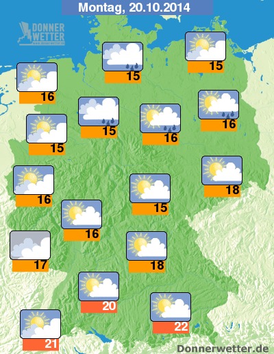 Die neue Woche startet deutlich wechselhafter und kühler als die vorherige endete. Atlantische Tiefausläufer bringen verbreitet feuchte Luftmassen heran, so kann sich zwischen den Wolken zwar zeitweise die Sonne zeigen, jedoch fällt gebietsweise auch Regen und zum Teil sind kräftige Schauer möglich. Die Temperatur steigt noch auf 15 Grad im südwestlichen Thüringen und auf bis zu 22 Grad in München.