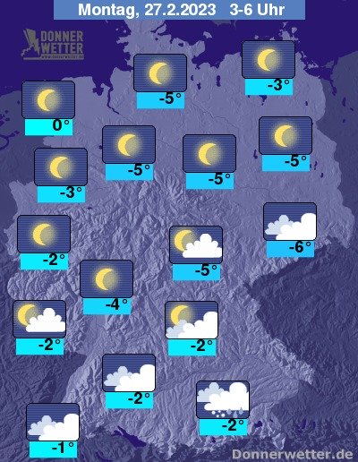 In der folgenden Nacht zeigt sich der Himmel südlich des Mains sowie rund ums Erzgebirge meist stark bewölkt bis bedeckt, im Alpenvorland und am Erzgebirge fällt zudem noch gebietsweise Schnee. Im großen Rest der Republik ist der Himmel verbreitet sternenklar oder nur gering bewölkt, dazu bleibt es natürlich trocken. Die Temperatur sinkt auf 0 Grad an der Nordseeküste und bis -6 Grad in der Lausitz.