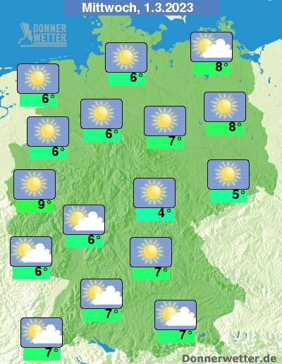 Am Mittwoch zeigt sich nach örtlicher Nebelauflösung verbreitet die Sonne und es ziehen nur lockere Wolkenfelder durch. Bei Höchstwerten von 4 Grad in Erfurt und bis 9 Grad in Köln bleibt es landesweit trocken.