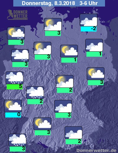 Am Donnerstag halten sich im Norden anfangs dichte Wolken und es fällt hier und da noch Regen, sonst ist es über der Nordhälfte bereits verbreitet heiter und trocken. Im Süden ist es heiter bis aufgelockert bewölkt und zunächst trocken, gegen Abend ist im Südwesten erster Regen möglich. Die Temperatur steigt auf 4 bis 11 Grad.