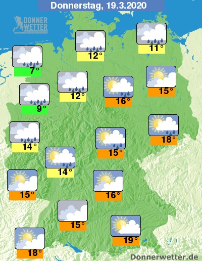 Am Donnerstag ist es im Süden meist heiter bis sonnig, in der breiten Landesmitte überwiegend wechselnd bis stark bewölkt, dabei bleibt es weitgehend trocken. Im Norden ist es verbreitet dicht bewölkt und es fällt auch gebietsweise Regen. Die Temperatur steigt auf 7 Grad im nördlichen Emsland und bis auf frühlingshafte 19 Grad in München.