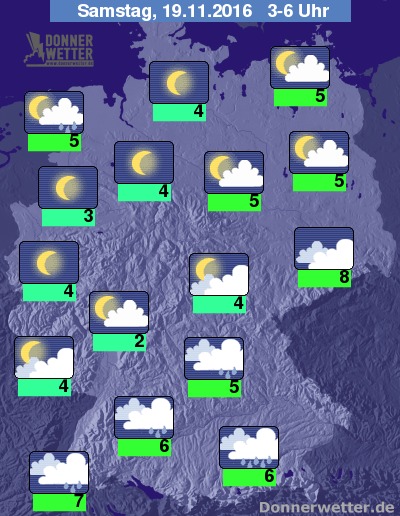 In derfolgenden Nacht klart der Himmel im Norden und Westen verbreitet auf, hier bleibt es auch trocken. Im Süden und Südosten fällt dagegen aus dichten Wolken immer wieder Regen. Stark bewölkt, jedoch weitgehend trocken bleibt es von Thüringen bis nach Sachsen. Die Temperatur sinkt auf 8 bis 3 Grad.