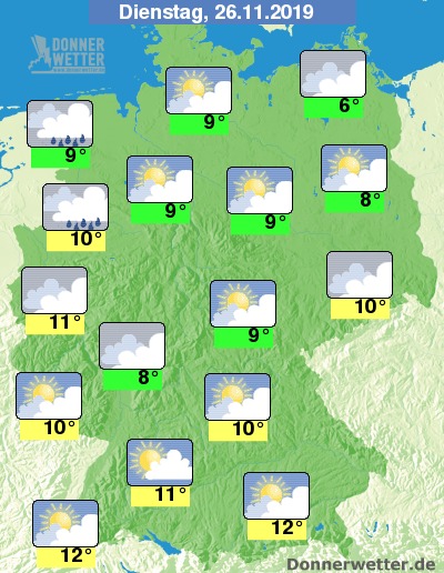 Am Dienstag ist es ebenfalls weitgehend trüb oder stark bewölkt und die Sonne kann nur örtlich mal zwischen den Wolken durchscheinen. Regen fällt jedoch nur im Emsland gebietsweise, sonst bleibt es trocken. Die Temperatur steigt auf 6 Grad in Stralsund und bis 12 Grad in München.