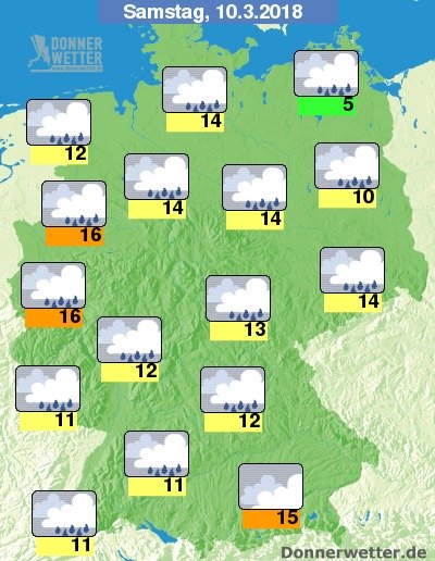 Am Samstag bleibt es bei dichten Wolken und es fällt immer wieder Regen. Die Temperaturen steigen auf Werte zwischen 5 Grad an der Müritz und bis 16 Grad im Rheinland.