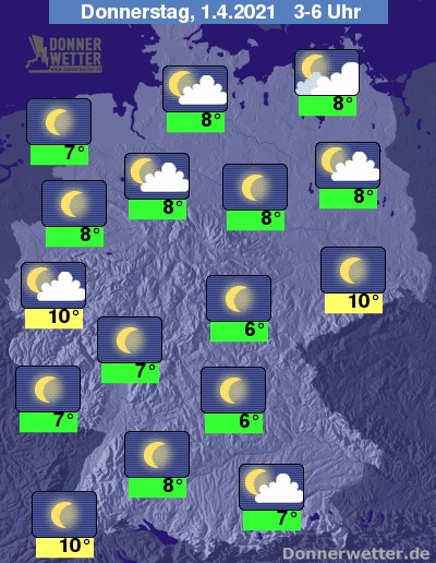 In der Nacht zum Donnerstag ist es überwiegend sternenklar, regional ziehen auch lockere Wolkenfelder durch, dazu bleibt es trocken. Die Temperatur sinkt auf 10 Grad am Oberrhein und bis 6 Grad im Eichsfeld.