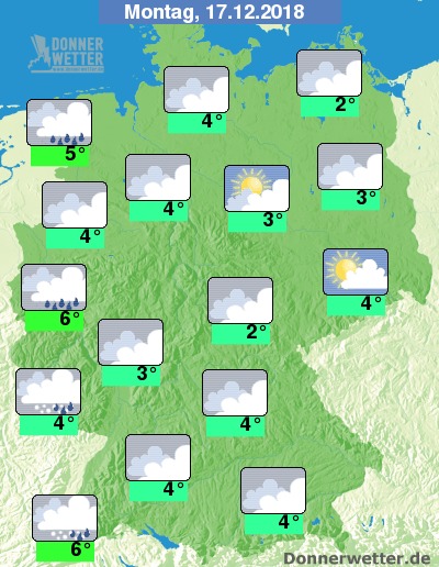 Heute zeigt sich das Wetter verbreitet trüb oder stark bewölkt, jedoch bleibt es größtenteils trocken, in den westlichsten Landesteilen fällt allerdings gebietsweise auch Regen, zum Teil Schneeregen. Die Temperatur steigt auf 2 Grad an der Müritz und bis 6 Grad am Rhein.